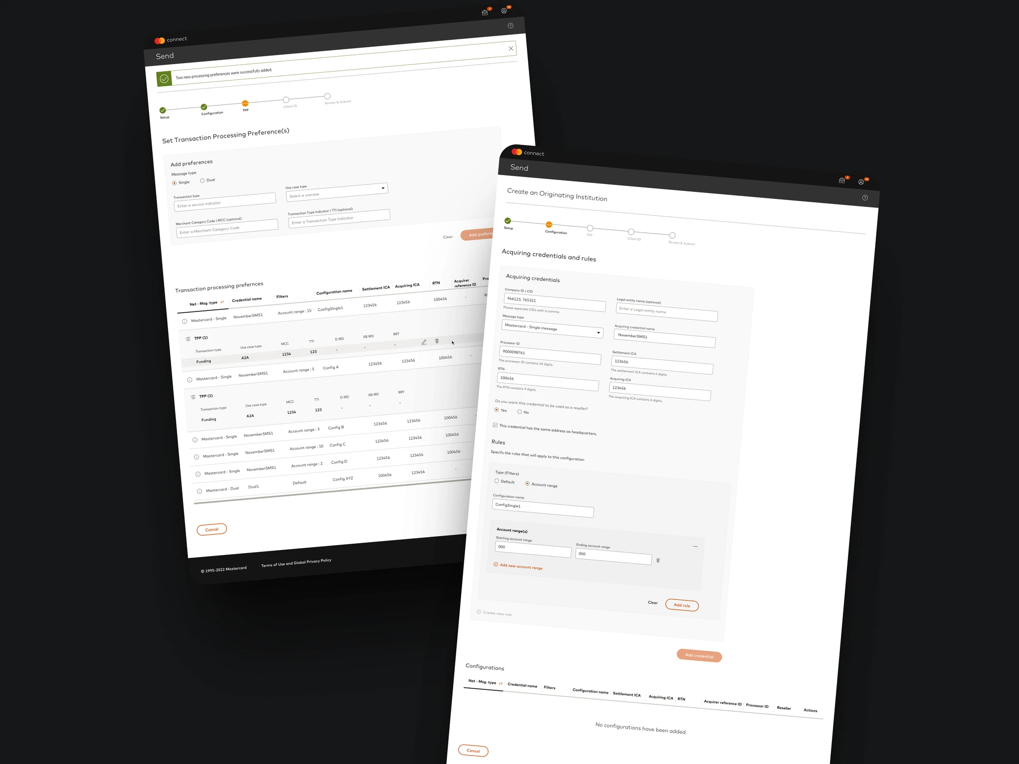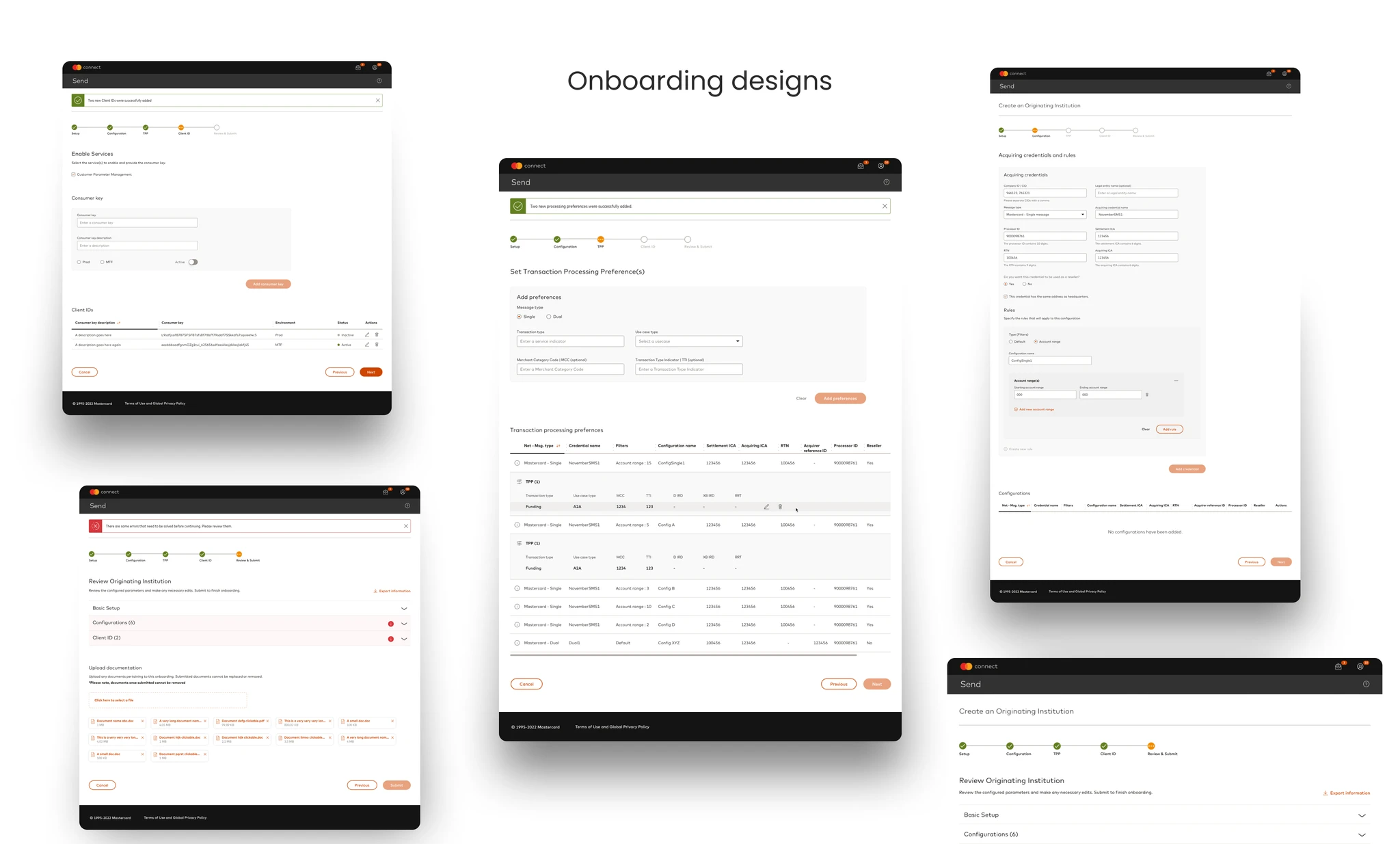 Mapped the complexity before designing anything. I worked through Mastercard's documentation and ran sessions with business analysts to understand the exact flows — including onboarding for Originating Institutions, configuration for Transaction Initiators, and transaction processing preferences. Understanding the business logic was a prerequisite to designing the UI.